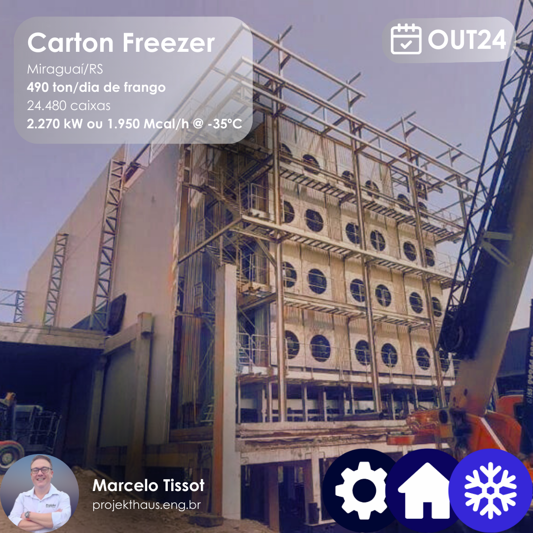 Túnel contínuo para bovinos, com capacidade térmica de 1.000.000 Kcal/h, ou 1.162,8 kW a -35ºC. Serpentinas de amônia. Ventiladores axiais.